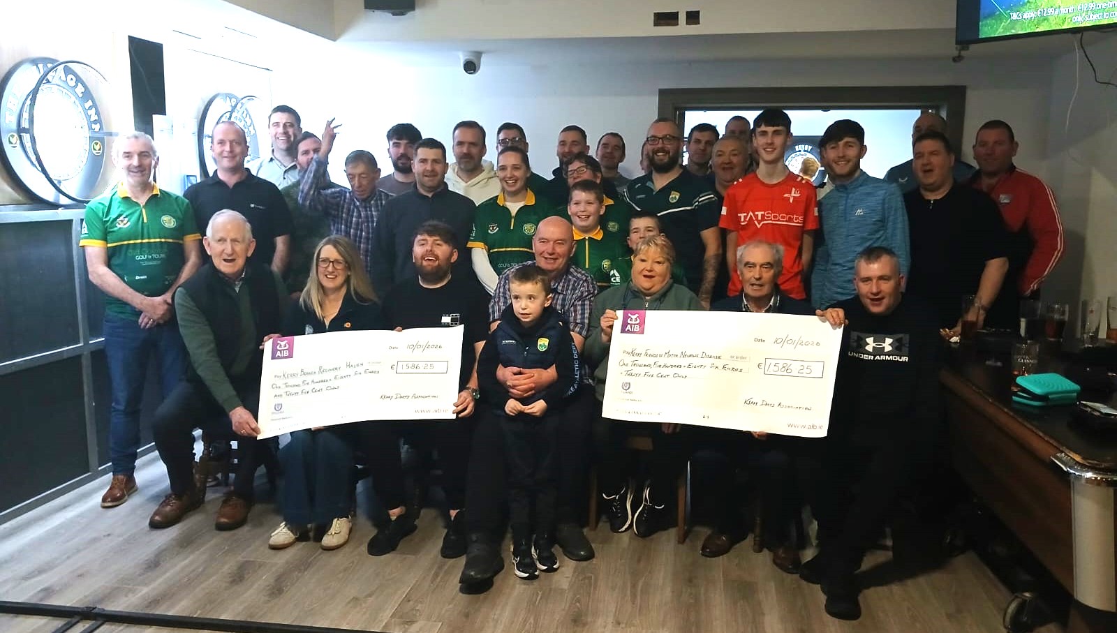 Kerry Friends of Motor Neurone received a cheque for €1,586.25, with a matching amount presented to Siobhain McSweeney and Cathal Walshe on behalf of Recovery Haven Kerry Branch.