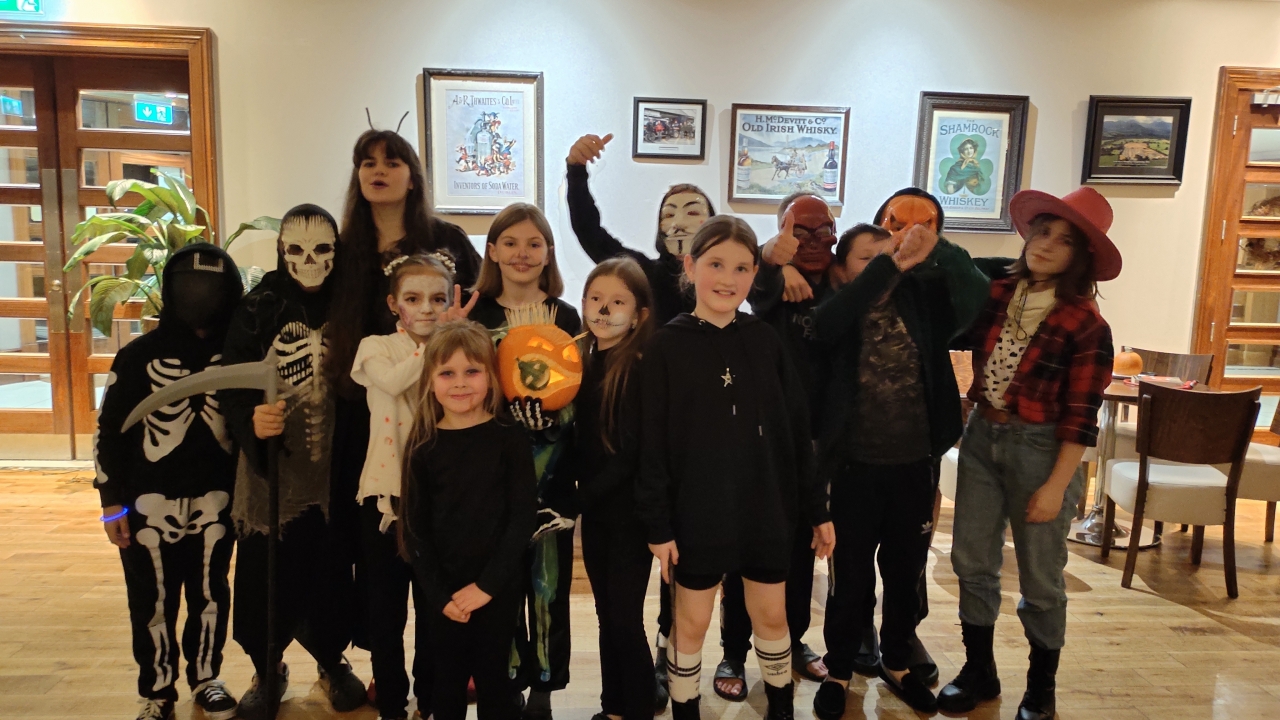 But the real event unfolded at the Innisfallen Hotel in the evening. Then the adults prepared a performance for the children in which the evil pumpkin monster came to feast on the children. The forces of good together with the children had to go through quests and guess all the riddles in order to defeat the pumpkin monster. The children really enjoyed running around the hotel and looking for clues to solve the riddles. The hotel was filled with children's laughter, noise and happy exclamations when another mystery was solved. As a team, the children were able to defeat the pumpkin monster played by Vasyl Melnychuk.