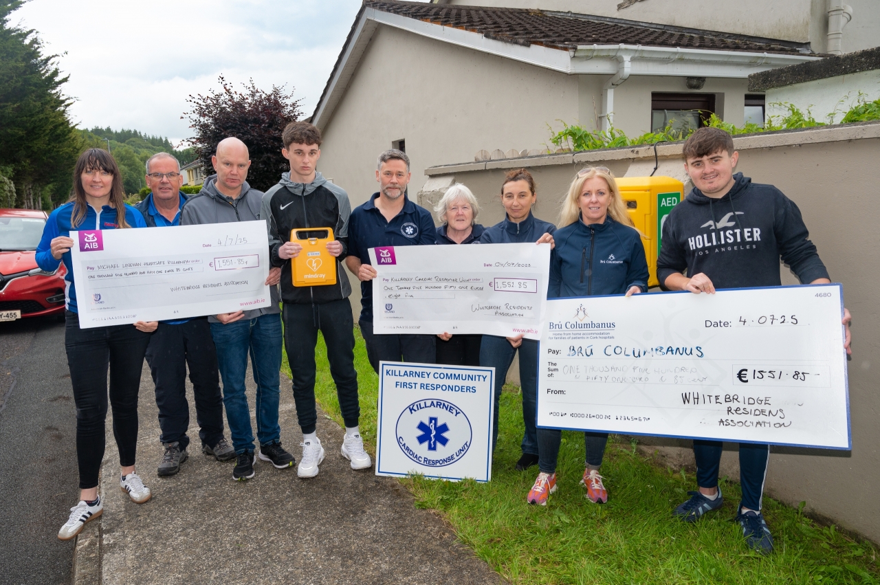 Good news continues from Whitebridge Manor in Killarney, where residents have donated over €4,600, collected for a community defibrillator, to three local charities.
